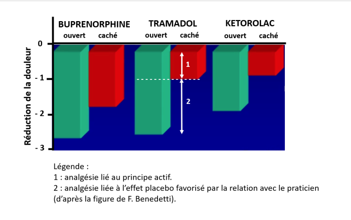 Un des facteurs majeurs pouvant moduler ces effets est la qualité de l’interaction entre le patient et le praticien (3). L’importance de la relation est illustrée par une série d’études sur l’effet de substances actives lors d’une administration « ouverte » (le soignant est présent lors de l’administration et rassure son patient) ou « cachée » (c’est une machine qui commande la délivrance la substance). La seule différence entre les deux conditions réside dans la relation avec le clinicien, permettant ainsi d’estimer l’effet de cette relation sur le traitement donné. Le résultat est sans appel : une analgésie significativement plus importante a été montrée chez les patients en interaction avec un praticien par rapport aux patients qui recevaient le même médicament par le biais d’un appareil, que ce soit avec de la buprénorphine, du tramadol ou du kétorolac (4, figure).