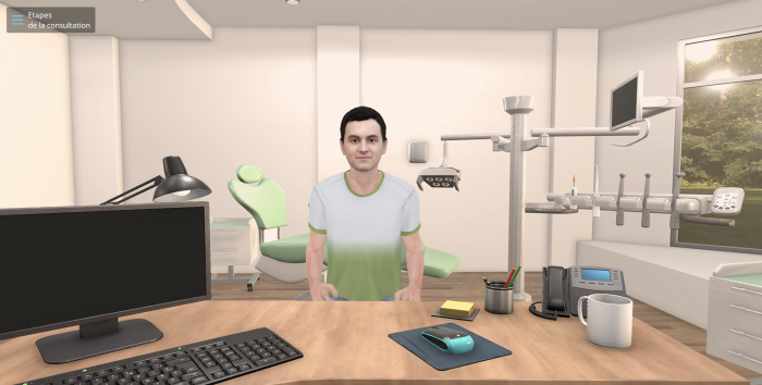 J.L. et E.G. : Notre expertise réside dans la création de simulateurs numériques pour la consultation de professionnels de santé. Ces outils visent à établir l’historique médical, le dossier médical, les antécédents et les traitements en cours d’un individu, afin de poser un diagnostic et d’adopter une approche thérapeutique adaptée. Jusqu’à présent, nous n’avions pas eu l’occasion de travailler dans le domaine dentaire. L’ADF nous a fourni les connaissances et les données nécessaires pour élaborer des simulations, notamment des scénarii de cas cliniques comprenant des dossiers patients fictifs inspirés de la réalité du quotidien. Ces éléments nous ont permis de créer des séquences de consultations dans un cabinet dentaire virtuel. Grâce à ces simulateurs, les apprenants peuvent être interrogés sur les attitudes à adopter, les bonnes pratiques et les recommandations concernant des patients virtuels conçus par l’ADF.